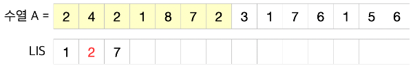 A[1]인 4는 LIS에 들어간 원소의 가장 마지막 숫자(LIS[length-1] = 2)보다 크기 때문에 LIS 배열에 들어가며 length은 증가하게 된다.