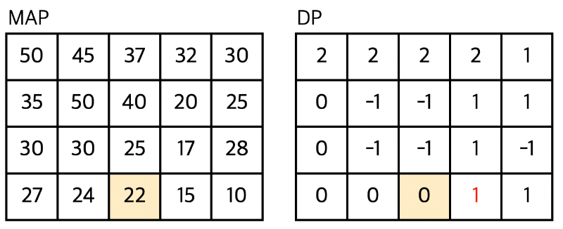 DP 테이블을 -1로 초기화 한 뒤 출발지점부터 탐색을 시작