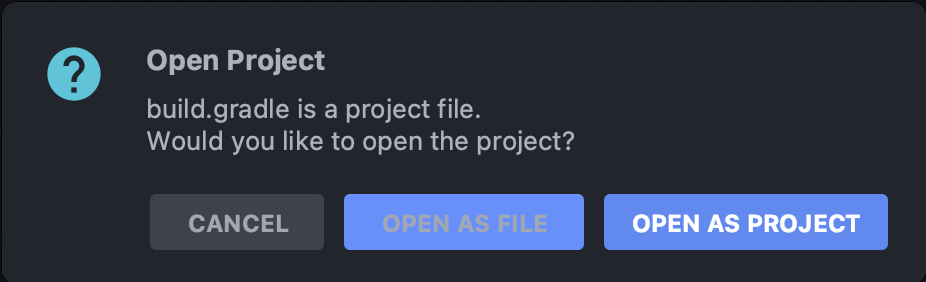 `build.gradle`을 통해 오픈을 누르면 이렇게 프로젝트로 열것인지 물어보는데 이때 프로젝트로 오픈하면 된다.