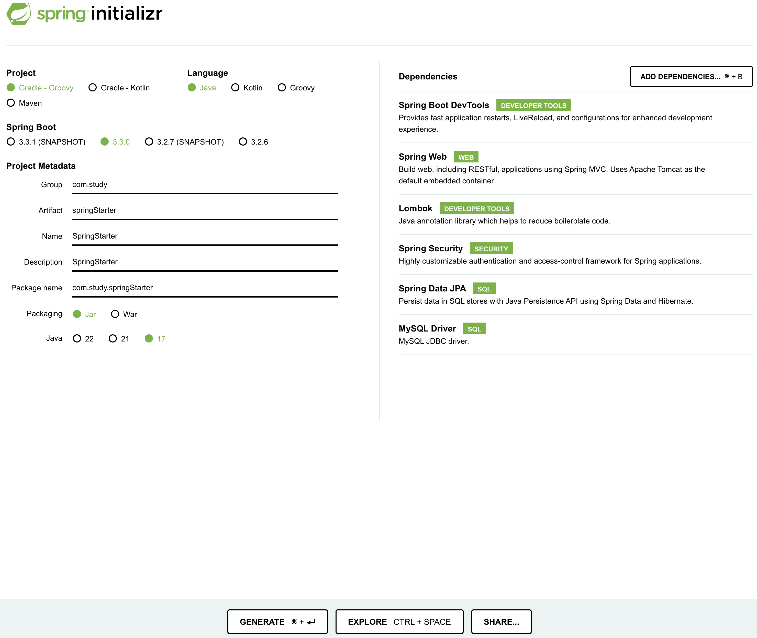 오른쪽에서는 의존성을 추가할 수 있다. 나중에 추가할 수도 있기때문에 지금은 `SpringWeb`만 있어도 되지만 후에 넣게 될 롬복과 시큐리티, JPA, MySQL 등의 의존성을 미리 추가해두었다.