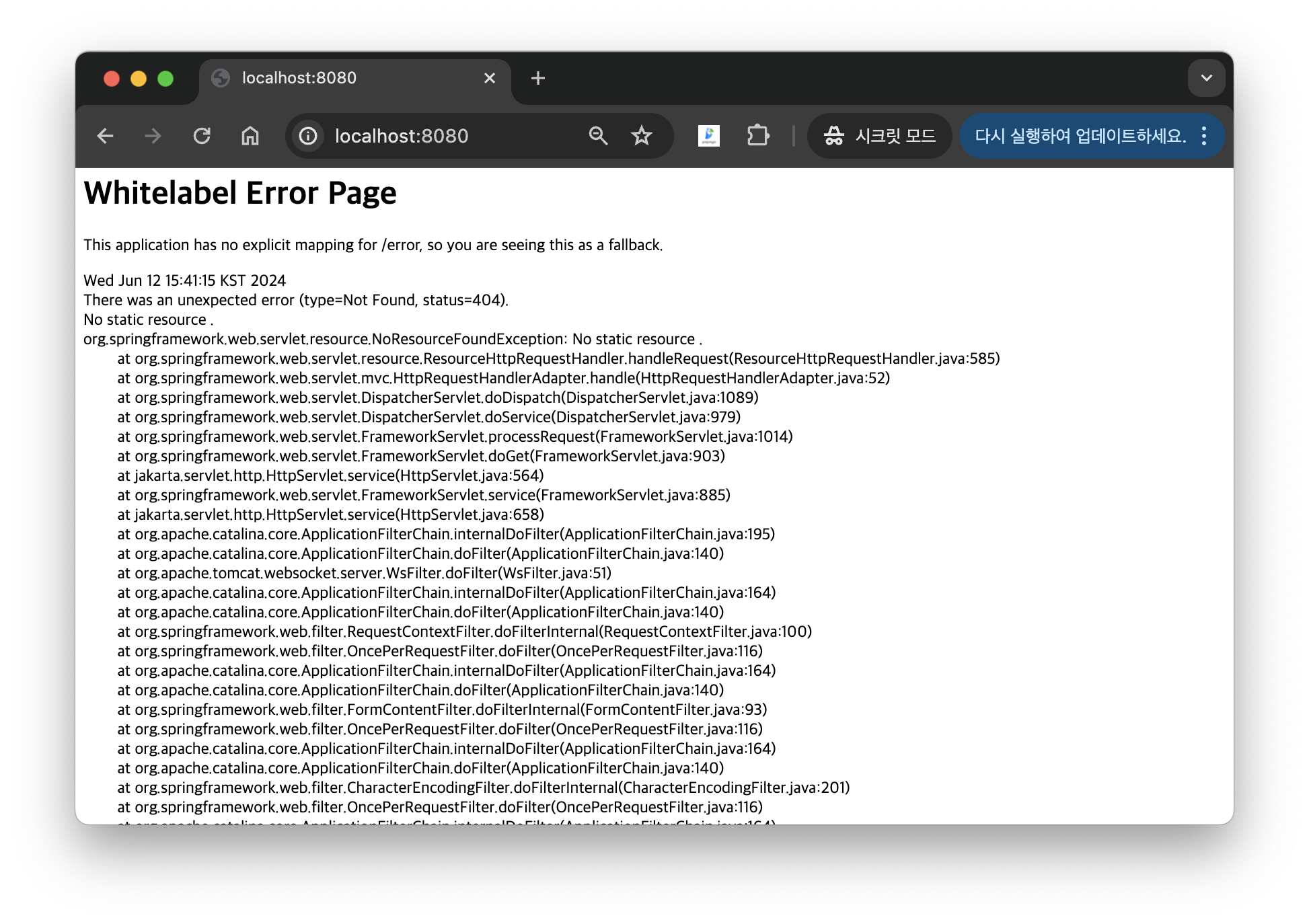 인터넷 창을 열어 http://localhost:8080/ (포트번호는 다를 수 있다.)로 접속했을 때 위와 같이 에러 페이지가 뜬다면 프로젝트가 제대로 실행된 것이다.