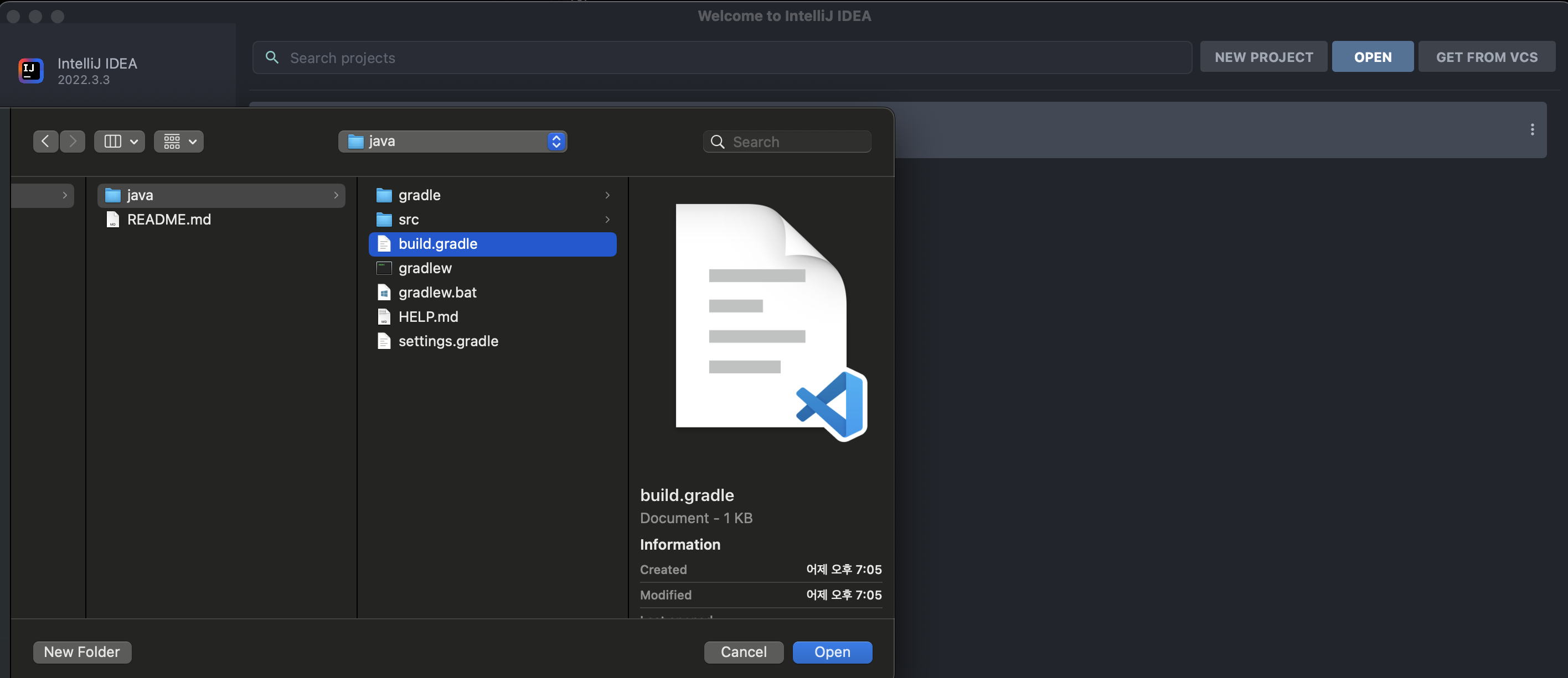 인텔리제이에서 프로젝트 폴더를 열어도 되지만 `build.gradle`을 통해 프로젝트를 열 수 있다.