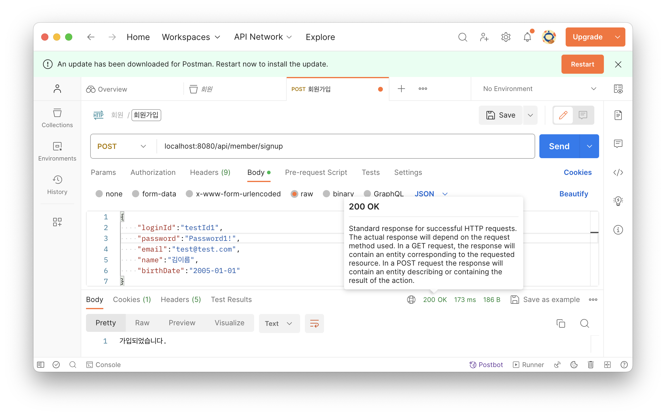 마지막으로 Controller를 위와 같이 반환값을 `BaseResponse`, Request 앞에 `@Valid` 어노테이션을 추가해 주면 마무리된다.