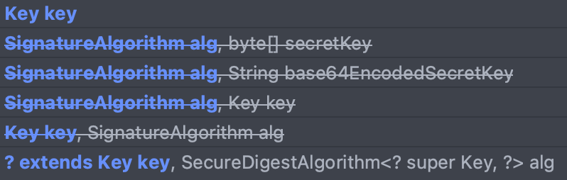 1.0 버전에서는 사라질 예정이라고 하니 위처럼 `Jwts.SIG.HS256` 등으로 암호화 알고리즘을 설정하고 SecretKey를 매개변수로 받는다.