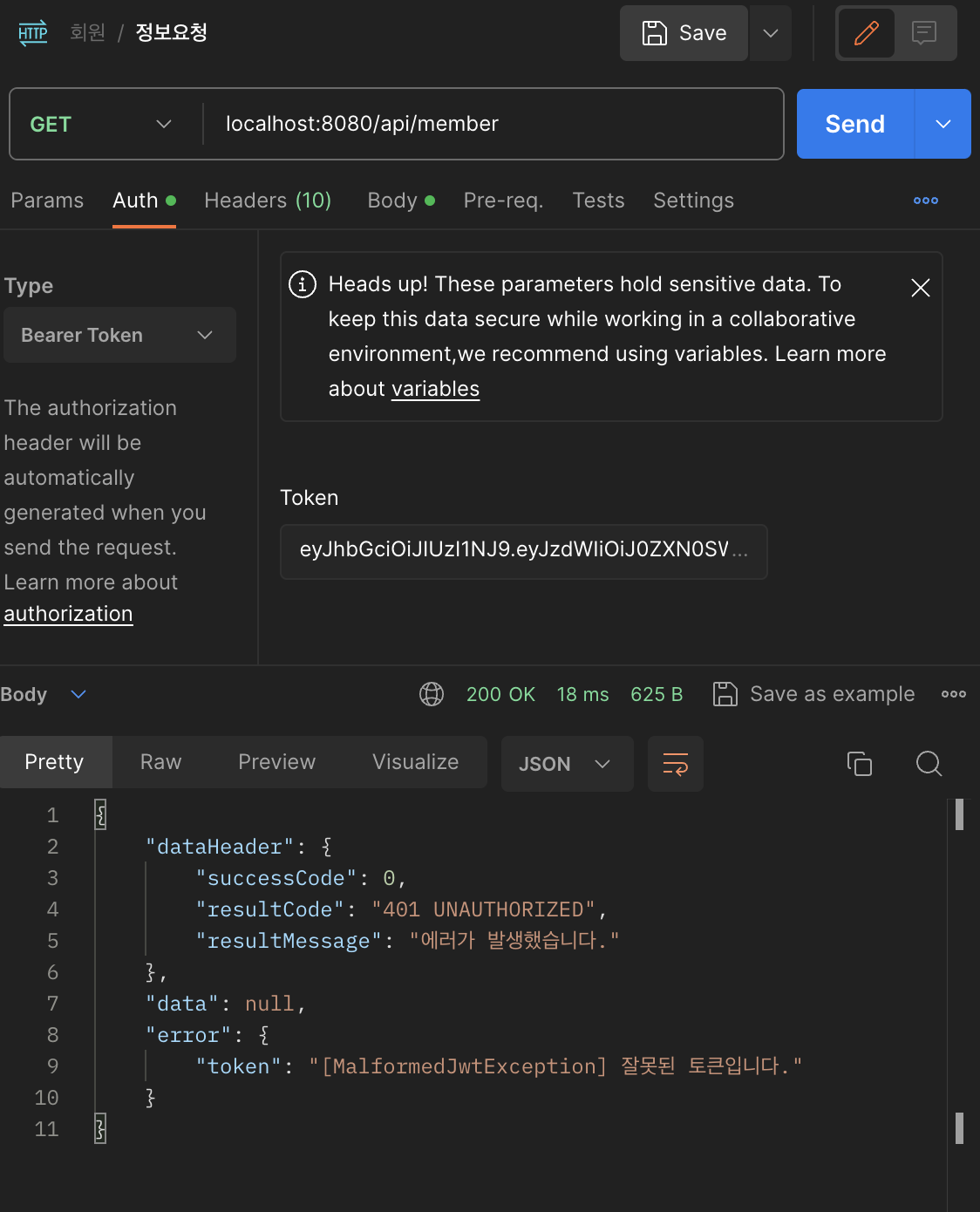 auth에서 Bearer Token을 선택하고 토큰을 넣어 요청을 보내게 되면 위처럼 제대로 실행되는 것을 알 수 있다.