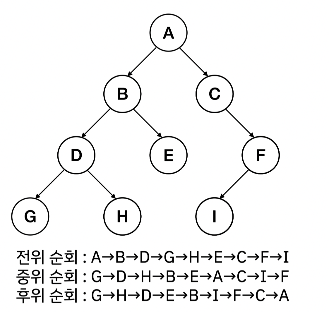 모든 순회의 시작은 루트노드부터 시작한다. A를 기준으로 B와 그 아래 트리를 왼쪽 서브트리, C 아래를 오른쪽 서브트리라 한다.