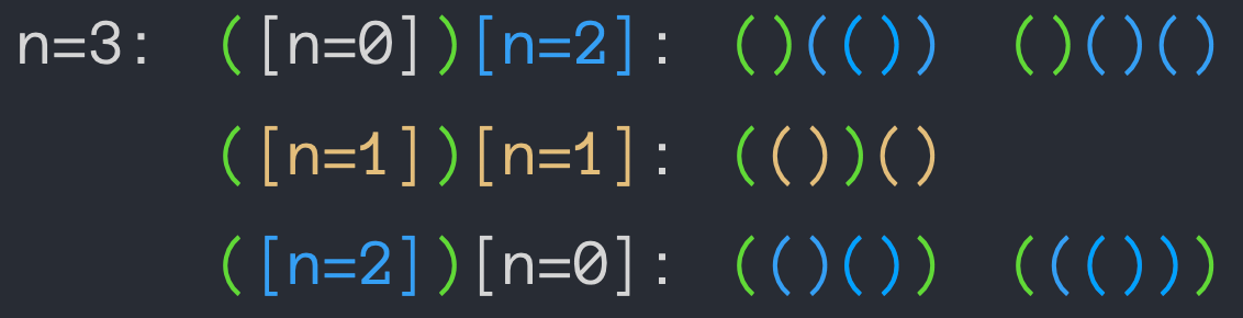 이렇게 된다. 즉 n쌍으로 만들 수 있는 경우의 수는 `i`쌍을 괄호 안쪽에 넣고, `n-1-i`쌍을 괄호 오른쪽에 배치하는 값인 것이다. dp [3]을 식으로 나타내본다면