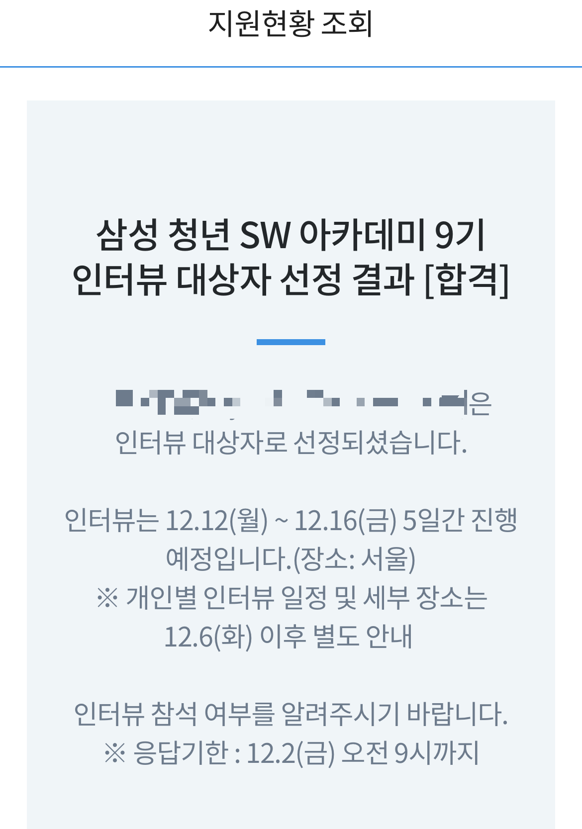 학교에서 프로젝트 발표회에 가있어서 결과를 잊고 있었는데 합격발표가 됐으니 확인하라는 문자를 받고 서둘러 확인했던 기억이 난다.