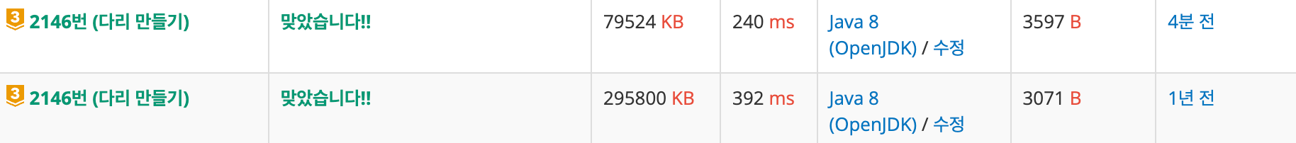 인터넷을 찾아보니 모든 섬의 가장자리를 전부 큐에 넣어두고 탐색을 시작하는 방법으로 구현하는 것을 봤다. 전체적인 BFS를 1번만 돌린다는 점에서 더 효율적이라는 생각이 들었다.