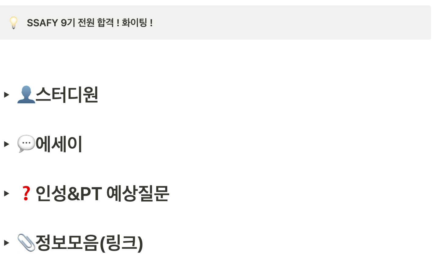 그리고 여러 블로그나 싸피 관련 글들이 정리되어있는 유용한 정보들을 공유하였고 pt면접을 대비해서 인터넷 기사들을 가져와 공유를 하기도 했다.